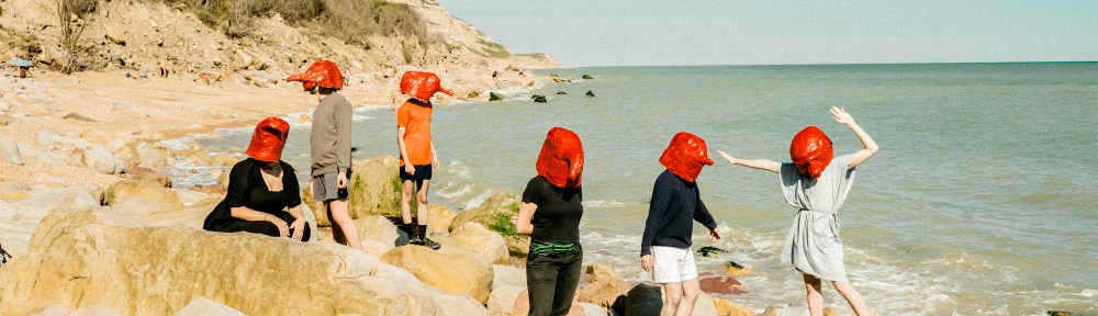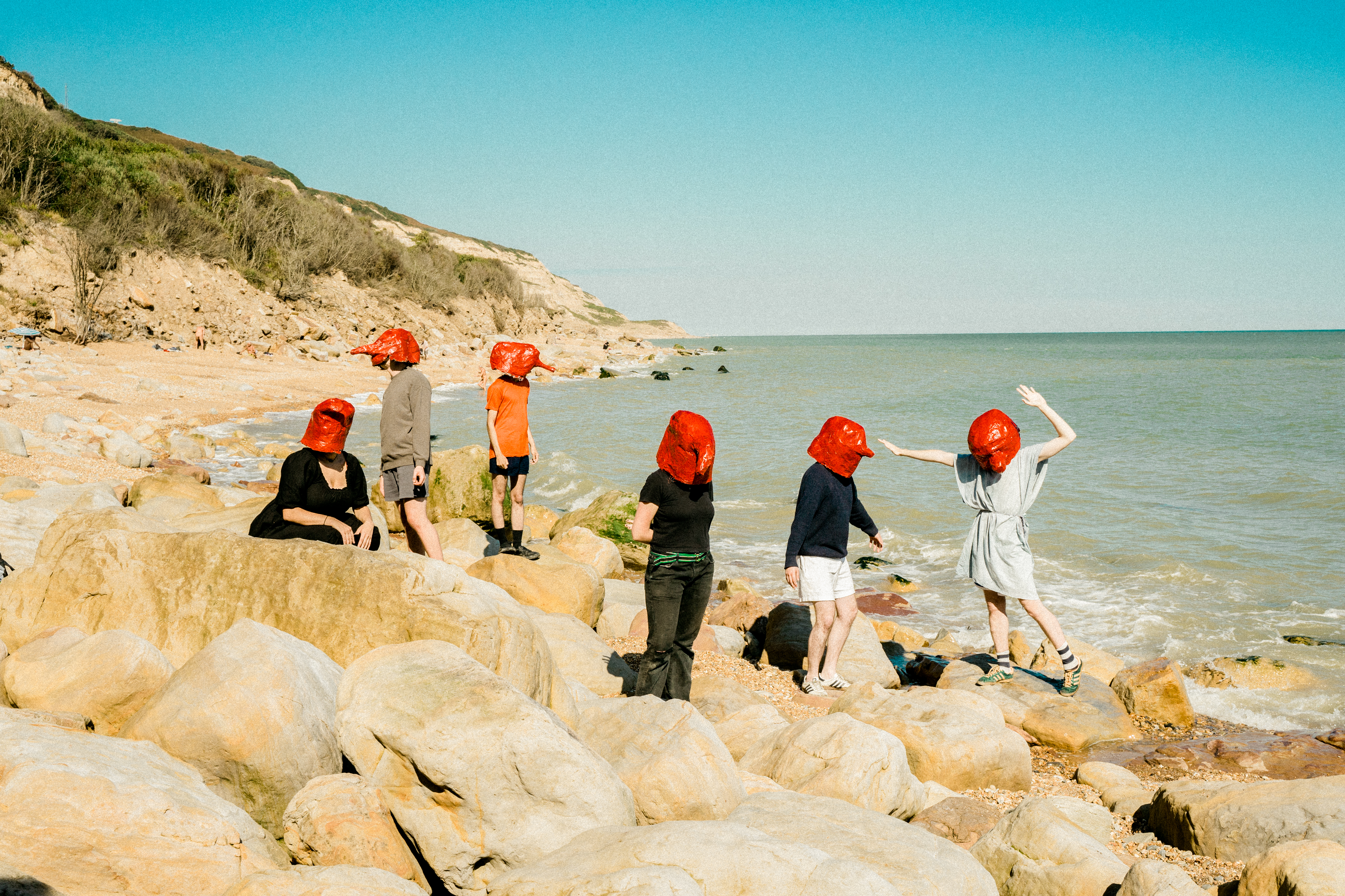 The South London six-piece – Ike Gray (vocals/guitar), Will McCrossan (keys/drum machine), Tom Rogers-Coltman (guitar/saxophone), Ronnie Longfellow (bass), Emily Hubbard (cornet/synth) and Wilf Cartwright (drums/cello) – describe Tapir! as a ‘boiling together’ of different mediums: at once musical, theatrical, mythological, artistic, collaborative, narrative-led and, above all, something to be enjoyed and shared. The Pilgrim, Their God and the King of My Decrepit Mountain, their first album, follows a three-act structure – released by Heavenly Recordings as three four-track EPs (Acts I and II in 2023, Act III early 2024) – telling the story of a solitary traveller, an ambiguous red creature known as The Pilgrim, on a journey across a mythical landscape. Prior to the pandemic, Gray and McCrossan had been putting on ultra-inclusive, ultra-informal poetry nights, creating comical videos and promoting gigs as part of the Brixton art collective My Life is Big. The platform had likewise motivated the pair to form Tapir! in 2019. Having brought Rogers-Coltman and Longfellow on-board during the pandemic (Hubbard and Cartwright would join later, in the summer of 2022), Tapir! released their debut single My God in February 2022. When Honeyglaze drummer Yuri Shibuichi saw Tapir! live at the venue, he encouraged them to record their songs, and the band stress it was his enthusiasm that led them to take the project more seriously. Shibuichi’s playful, carefree production (always urging the band not to overthink) perfectly suits Tapir!’s unassuming, handmade, DIY nature.